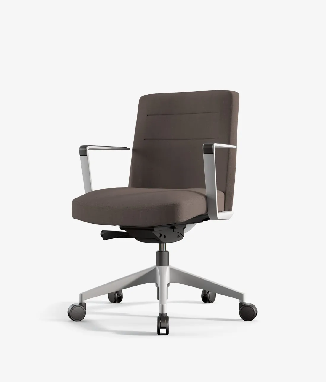 Este elegante y dinámico sillón directivo con base en aluminio con tapizado en marrón disponible en varios acabados y altamente personalizable, aúna las cualidades de una silla ergonómica fabricada con materiales innovadores con el confort y una buena salud postural durante toda la jornada.